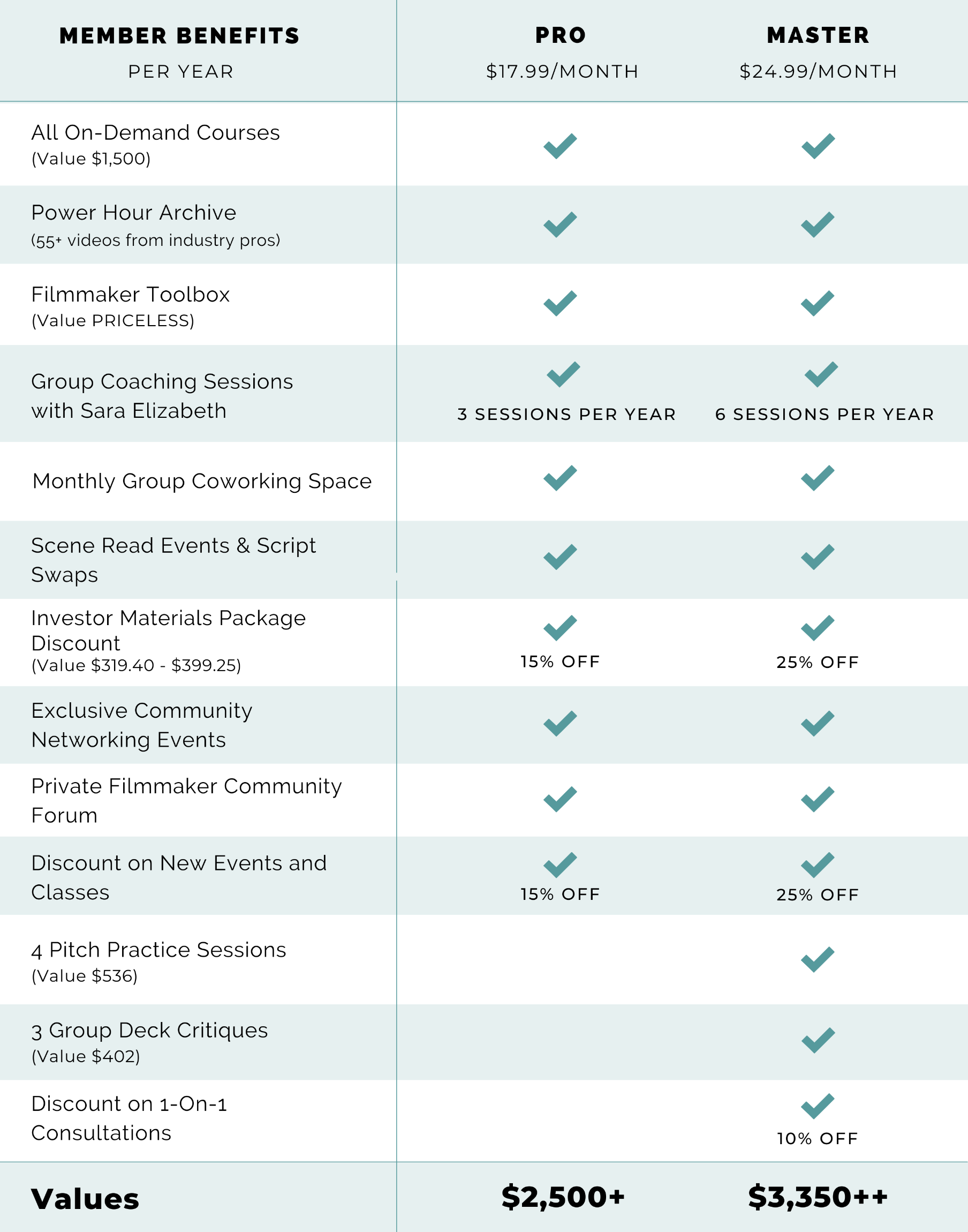 Originally, you could purchase some of our courses and resources separately- "a la carte". We realized that this can really start adding up for filmmakers and saw the membership as an opportunity to bundle all our on demand courses, with live resources which allows us to offer you resources at a MUCH cheaper rate. One year of membership is actually cheaper than it had been to purchase ONE master course a la carte! Also there are many exclusive offerings that only members can participate in and are not available to purchase a la carte. We LOVE the new membership option which makes it all both accessible and affordable!